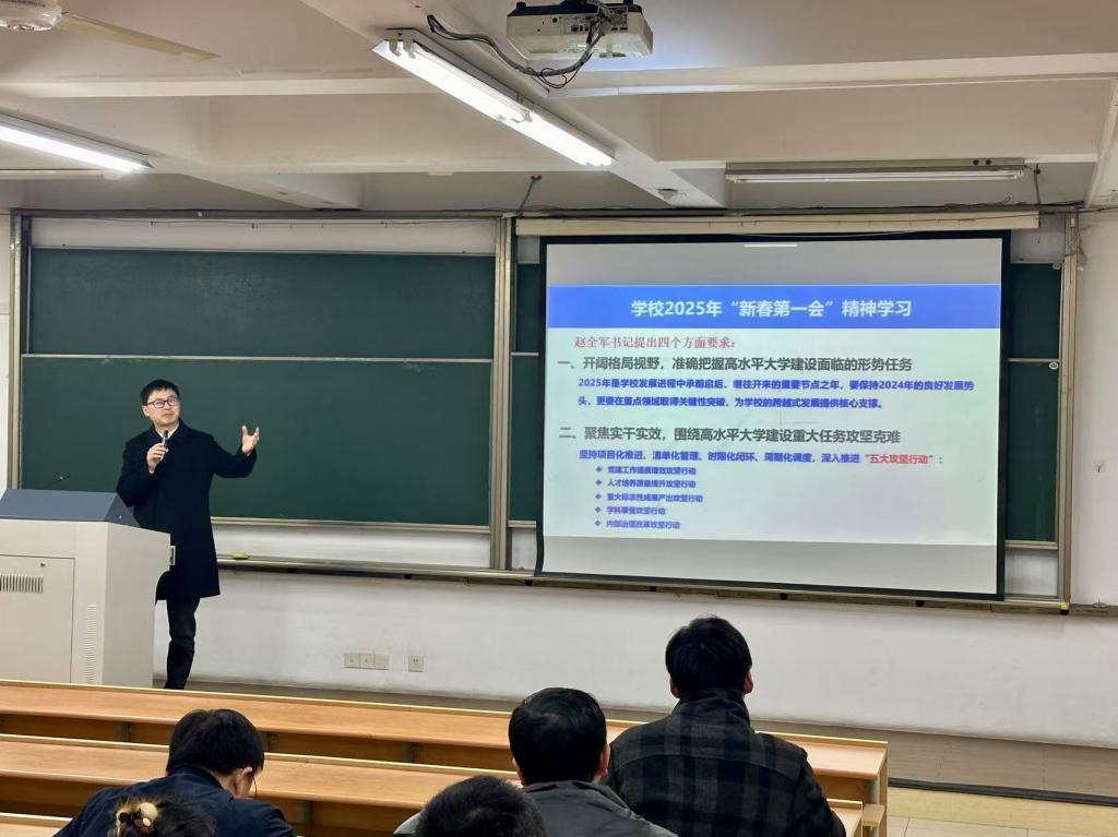 学术院长顾晓强结合学校新春第一会精神传达,对学院年度重点工作任务进行了部署。顾晓强指出,要紧密结合学校2025年高水平大学建设发展图景,积极对标学校“党建工作提质增效攻坚行动、人才培养质量提升攻坚行动、重大标志性成果产出攻坚行动、学科攀登攻坚行动、内部治理攻坚行动”五大攻坚任务,努力完成学院土木工程博士点增列申报、本科教育教学审核评估、高层次人才引育、科研经费、大项目大成果申报、人才培养和科研合作、国际化工作等重点攻坚任务。他强调,全体教师要坚定信心,贡献力量,合力推动学院重点任务落地。