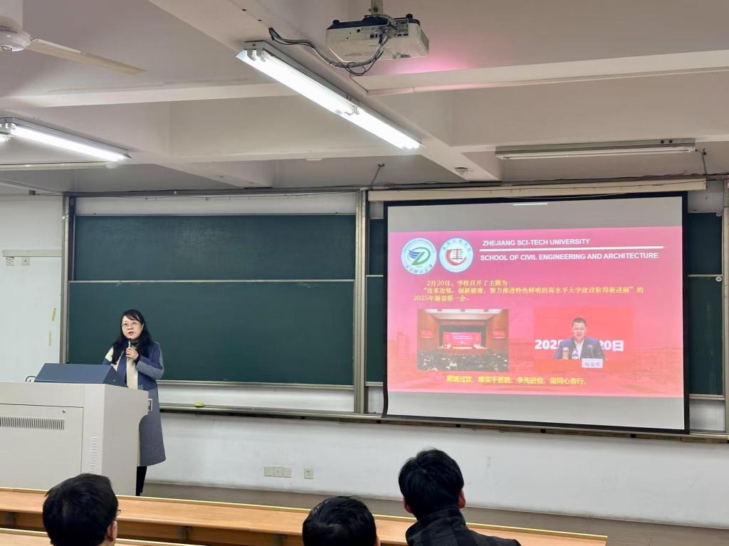 2月26日下午,建筑工程学院在7-105教室举行新学期工作部署会暨全体教职工大会。会议传达了党委书记赵全军、校长陈文兴在校2025年“新春第一会”的讲话精神和全面从严治党工作暨清廉浙理建设推进会相关精神等,号召全院教师聚焦实干实效,奋力完成新一年重点工作任务。学院全体教师参加会议。会议由副院长徐辉主持。