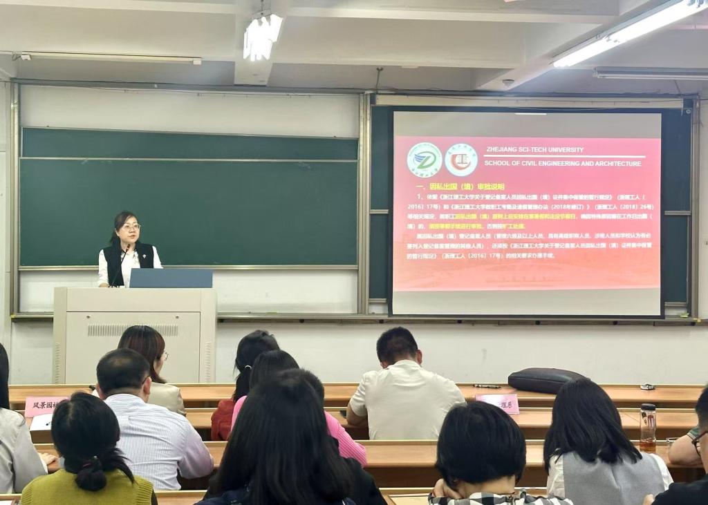 随后,李娜对教职工出(国)境管理工作和兼职管理规定等师德师风建设工作进行了主题宣讲,对相关情况进行了通报,对政策进行了深入解读。李娜指出,当前,全校上下正在开展深入贯彻中央八项规定精神学习教育活动,要把党的作风建设和规范教师从教行为相结合,广大教师要坚持法律法规和政策制度的学习,明晰并严格遵守出国(境)和校外兼职的相关要求,杜绝违反相关政策制度的行为发生,做有高尚师德的“四有”好老师。