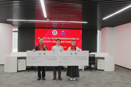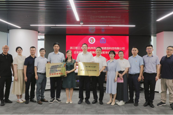 为扎实推进校企合作,深化产教融合,全面提升人才培养质量与社会适应度,7月16日下午,浙江理工大学与杭州吾盛智能建造科技有限公司(下文简称“吾盛公司”)企业研发中心举行签约暨奖学金捐赠仪式。学院党委书记李娜、校对外联络办公室副主任应黎君、校产业技术中心副主任王顺利、副院长刘勇、学院党委副书记郑磊,萧山区北干街道党工委书记丁裕、风情街道科创社区书记陈婕,吾盛公司总经理孙杰、法人代表李兵、来锦紫、市场总监董振凯参加此次仪式。