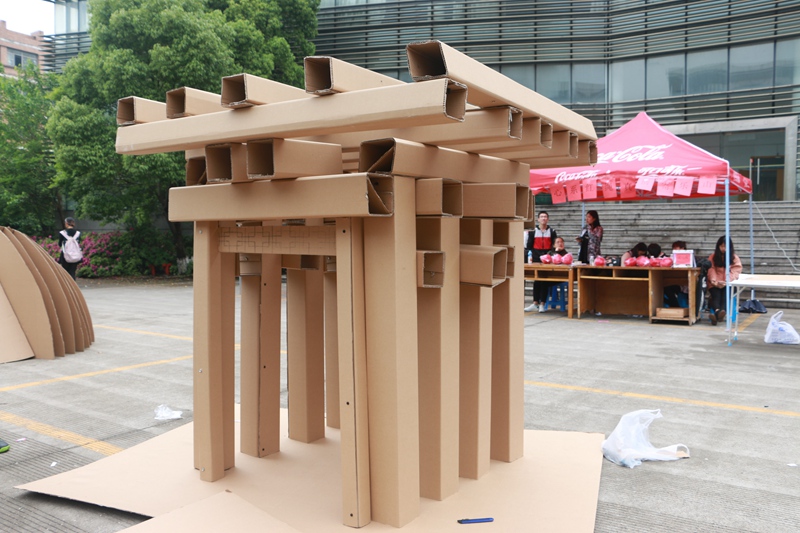 今天的浙江理工大学因此变得不同。当你路过学校的主干道你将远远看到一个个棕黄色的体块搭建在学活门口,走近便能瞧见这一件件筑作的细样。有的重复单元模数构成新个体,有的把平面创意拼接形成空间系列,也有用纸板围合一个开敞空间,大气而又不失优雅。你所看到的正是我们理工的一个个小筑作师精心搭建的作品。