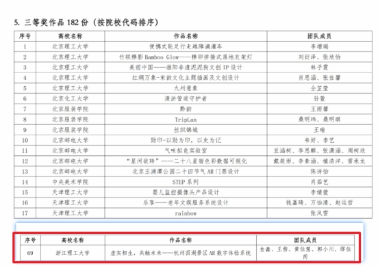 11月26日,由教育部学位管理与研究生教育司指导、中国学位与研究生教育学会和中国科协青少年科技中心主办的首届中国研究生“美丽中国”创新设计大赛在杭州建德落下帷幕。首届中国研究生“美丽中国”创新设计大赛于2023年6月12日正式启动,设置有环境空间设计、服装与服饰设计、工业产品设计、媒体传达计、建德主题设计五个不同赛道。大赛赛程历时6个多月,来自全国304所高校和科研院所的5943支团队、15559名研究生踊跃与,参赛规模居中国研究生创新实践系列大赛16项主题赛事前三。此次大赛共有284份作品进入等级奖名单,我院麻欣瑶胡广老师指导的研究生项目《虚实相生,共触未来一一杭州西湖景区 AR 数字体验系统》荣获全国三等奖,这也是学院“红筑未来”AR工作室的成果。