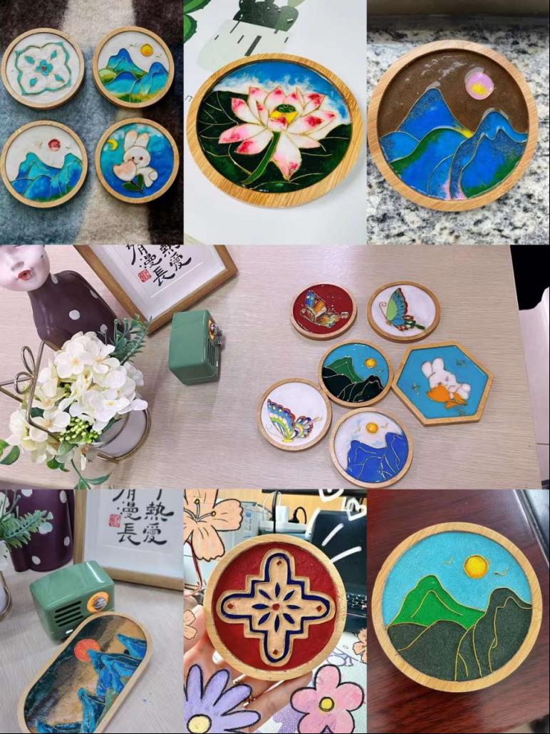 在听完指导要领后,老师们开始纷纷各自构图、掐丝、调色、上沙、固胶……如同雕琢艺术品一般,每个人都认真装饰着自己手里的作品,经过一道道工序,一件件“私人订制”的掐丝珐琅杯垫惊艳出炉。作为非遗,掐丝珐琅不仅是工艺也是艺术,流光溢彩,雍容华贵,展现真正的东方美学。