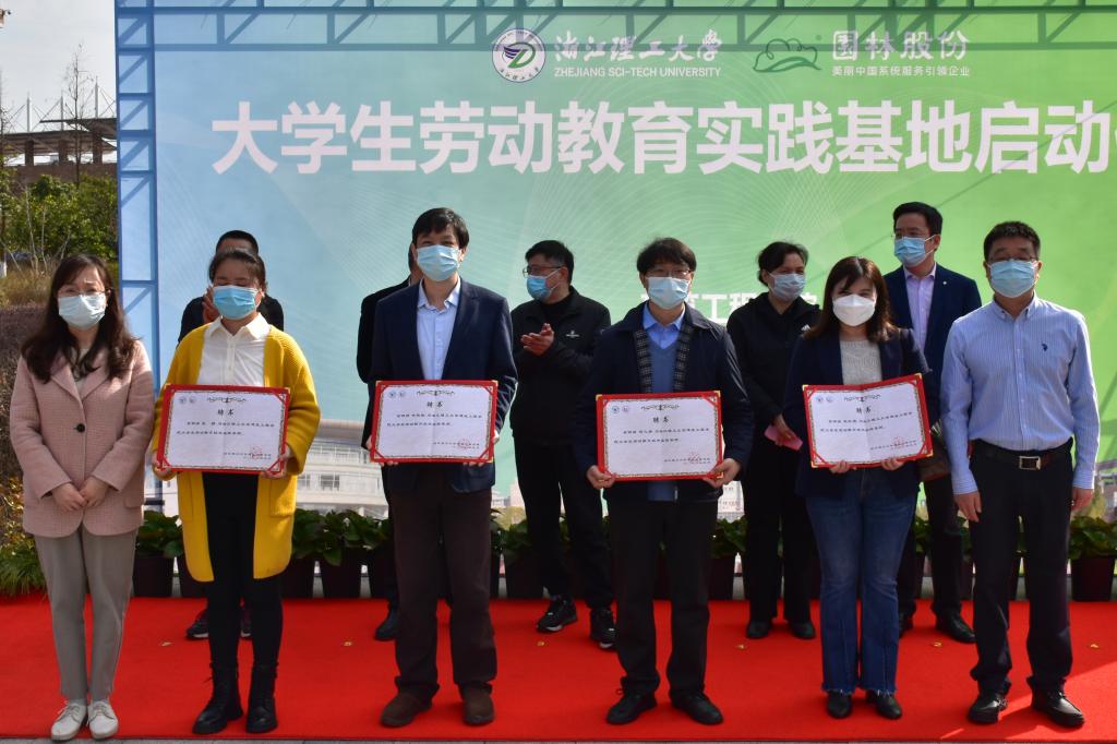 大学生劳动教育校内实践基地揭牌,李娜、俞峰为学生劳动教育实践校外导师颁发聘书。杭州市园林股份有限公司研究院工程技术中心主任张楠作为受聘学生劳动教育校外导师代表发言,表示将以身作则,言传身教,悉心指导同学们以专业引领实习实践,以劳动教育促进专业学习。许慧霞为课程思政建设专家指导委员会委员颁发聘书。
