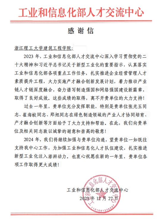 近日,工业和信息化部人才交流中心发来感谢信,对我院充分发挥职能,支持工业和信息化部人才交流中心人才队伍建设工作表示衷心感谢!感谢信特别指出,过去一年中,我院张光玉、崔海蛟、郑旭三位老师在绿色制造领域的产业人才协同培育、产才融合创新等方面给予了大力支持和帮助,由此向我院表示由衷的感谢和崇高的敬意。