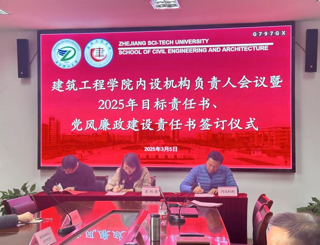 在7-504举行2025年目标责任书、党风廉政建设责任书签订仪式。学院党政班子成员、全体内设机构负责人出席会议。会议由学院党委书记李娜主持。
