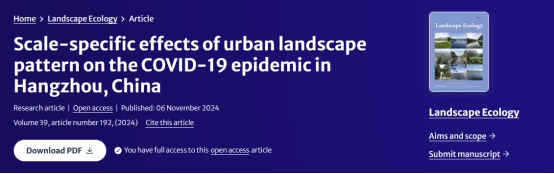 风景园林专硕研究生陈俊斌一作在《Landscape Ecology》发表了题为“Scale specific effects of urban landscape pattern on the COVID-19 epidemic in Hangzhou, China”的研究论文,该研究首次发现了不同的城市景观变量对新冠疫情空间风险的尺度特异性作用,有助于优化针对流行病传播的分区防控策略,并从多尺度等级框架的角度指导政策制定和城市规划,以进一步改善城市公共卫生和可持续水平。风景园林系胡广教授为该论文通讯作者。《Landscape Ecology》创刊于1987年,是国际景观生态学领域的旗舰杂志,主要探索有关景观生态学理论与方法、生态保护、土地管理、景观设计规划和景观作为耦合人环境系统的可持续性的基础和应用研究问题。5年影响因子4.9,JCR1区,中科院2区期刊。