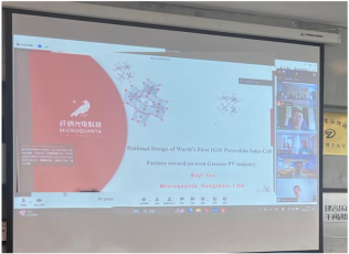 纤纳光电联合创始人兼CTO 颜步一博士介绍了纤纳光电的基本情况。纤纳光电先后9次登上钙钛矿组件光电转换效率世界纪录表,四次蝉联“太阳电池中国最高效率”钙钛矿单结领域冠军;全球累计申报300多项知识产权专利;承担了三项科技部国家重点研发计划,两项浙江省重点研发计划和浙江省领军型创新创业团队项目。颜总特别介绍了公司正在建设的全球首个1吉瓦钙钛矿光伏工厂的相关内容。