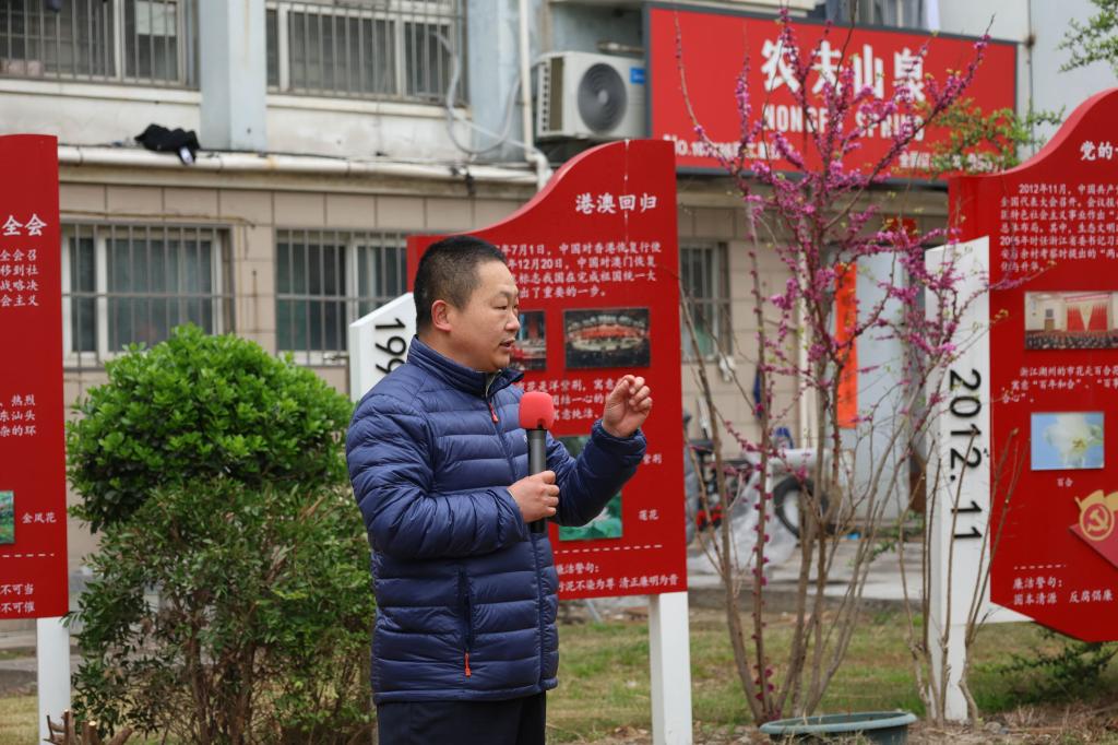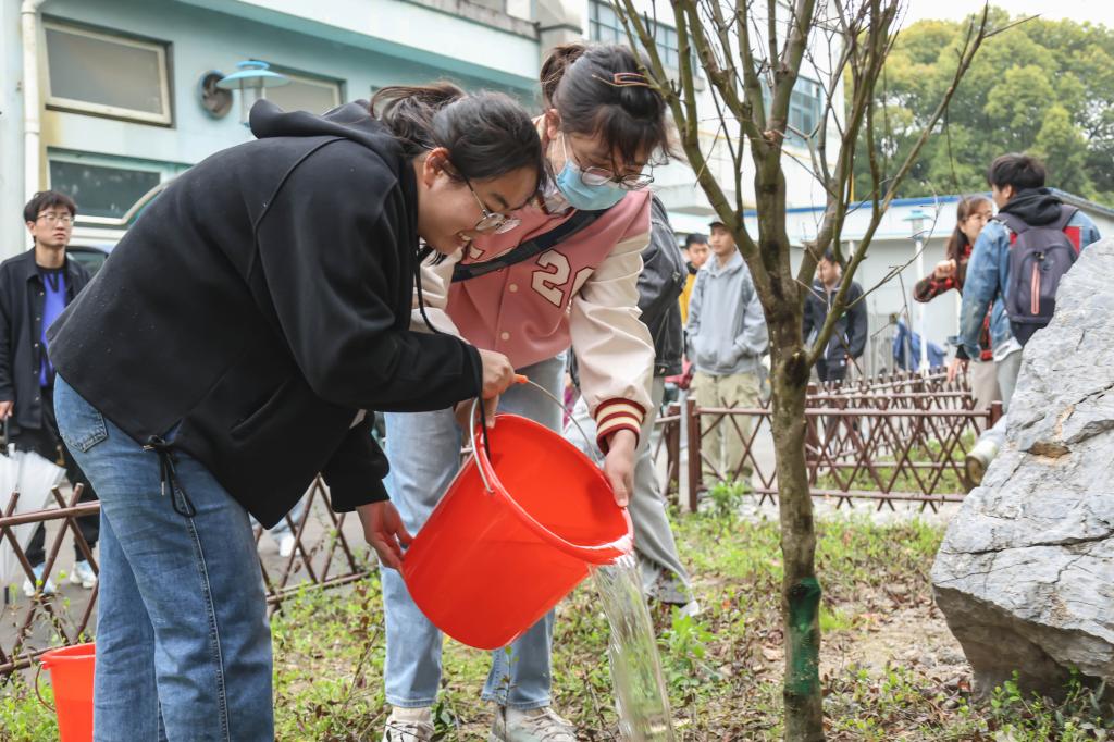 同学们一边栽树、浇水,一边倾听杨王虎等老师们讲述不同树种所蕴含的思政小故事,在劳动的过程中厚植理想信念。