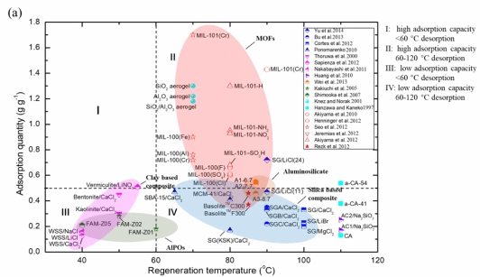 干燥剂的平衡吸附量和解吸能力和吸附-解吸动力学对系统的除湿性能有很大影响。该文对2015年之后的复合干燥剂的吸湿能力和再生温度进行归纳总结,并绘制成图。和2015年之前的干燥剂相比,目前,出现了不少落于区域I,即在低再生温度下(如 40~60 °C)同时具有较高吸附量(> 0.5 g·g-1)的复合干燥剂。特别是基于热响应聚合物 PNIPAM的复合干燥剂,可以实现40°C的快速再生。