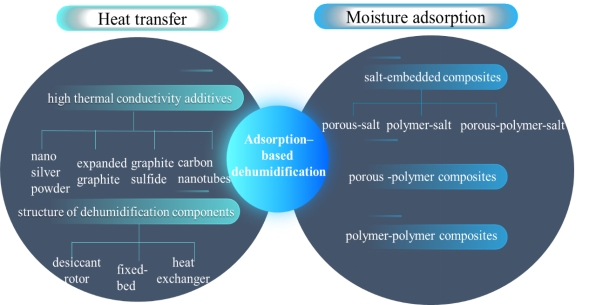 郑旭团队针对近年来基于吸附除湿的复合干燥剂材料进行全面综述,从传热与传质两个角度出发,介绍了如何提升传热性能和如何改善吸湿性能的途径。