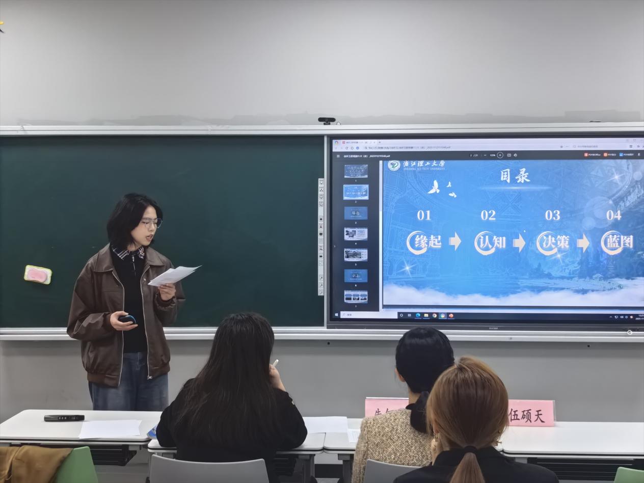 大赛特邀学院党委副书记兼纪委书记朱何璇老师、学工办主任刘濛怡老师、23级辅导员伍硕天老师组成专业评审团。三位评委全程认真聆听,从职业目标适配性、规划逻辑科学性、行动路径可行性等维度,为每位选手进行细致点评,让现场学子深受启发。